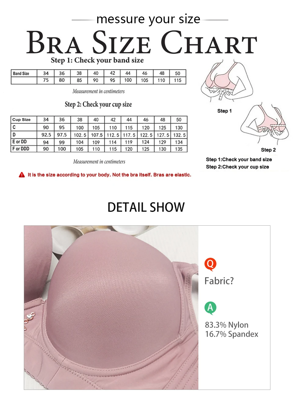 Band Size : 34=75 36 =80 38=85 40=90 42=95 44=100 46=105 48=110